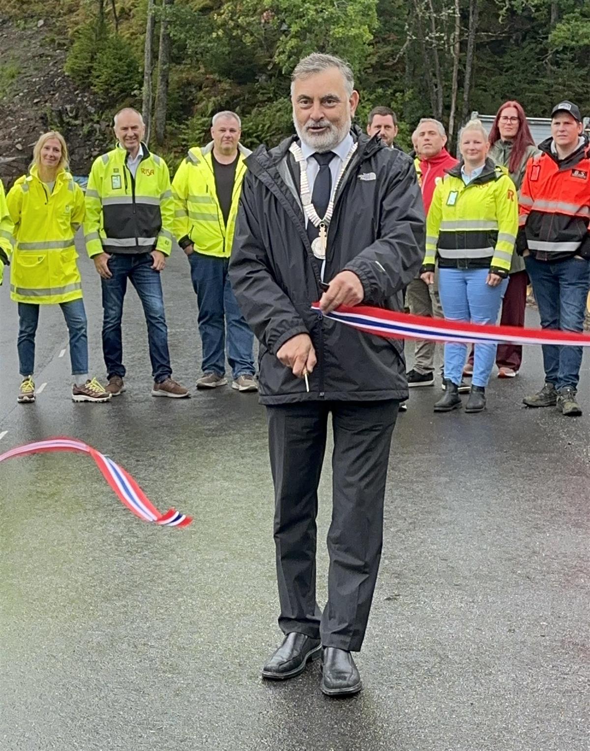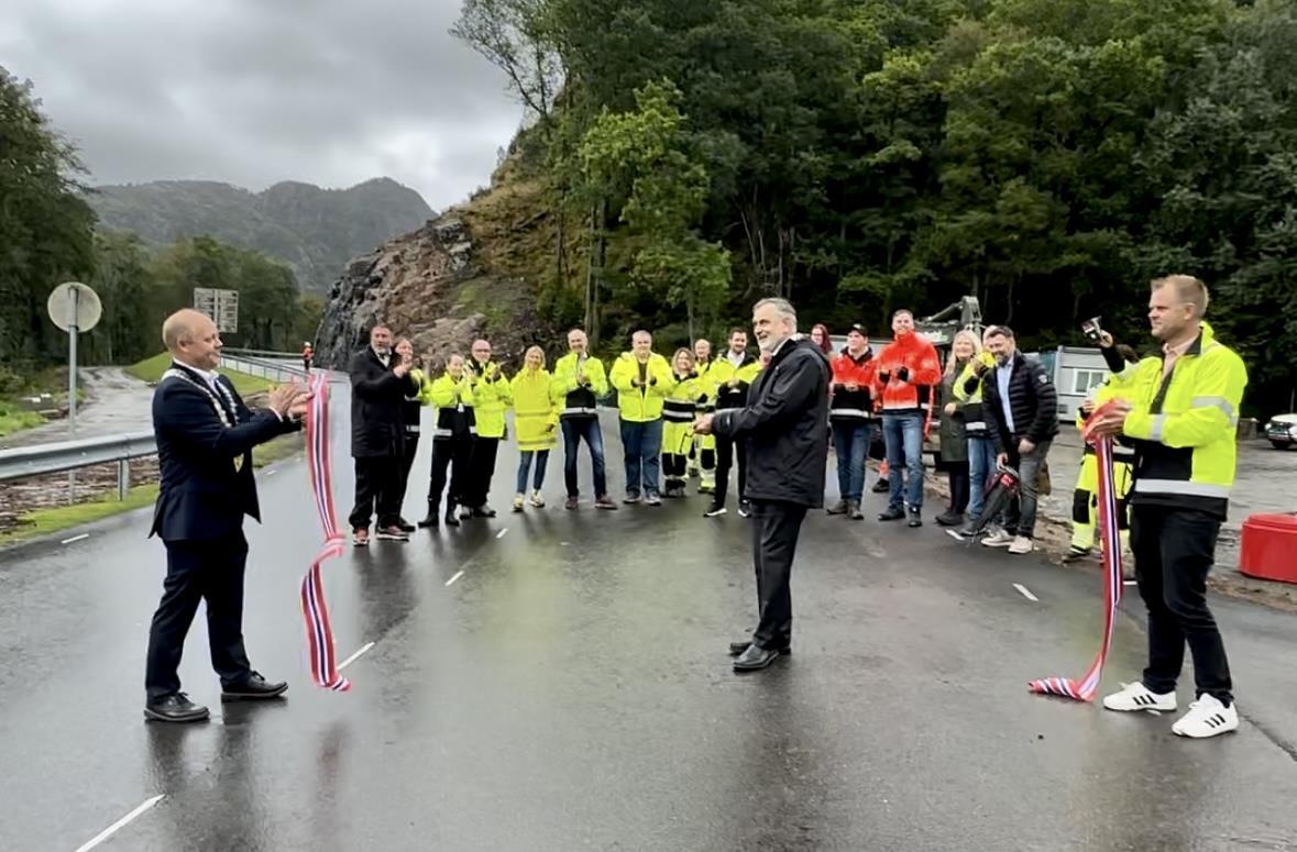 Fylkesvaraordførar Svein Erik Indbjo kutta båndet for den nye vegen.Med på markeringa var fylkesvaraordførar Svein Erik Indbjo, ordførar i Sokndal kommune Bjørn-Inge Mydland, Harald Bøhn leiar for eining prosjekt i samferdselsavdelinga og entreprenør Risa AS.