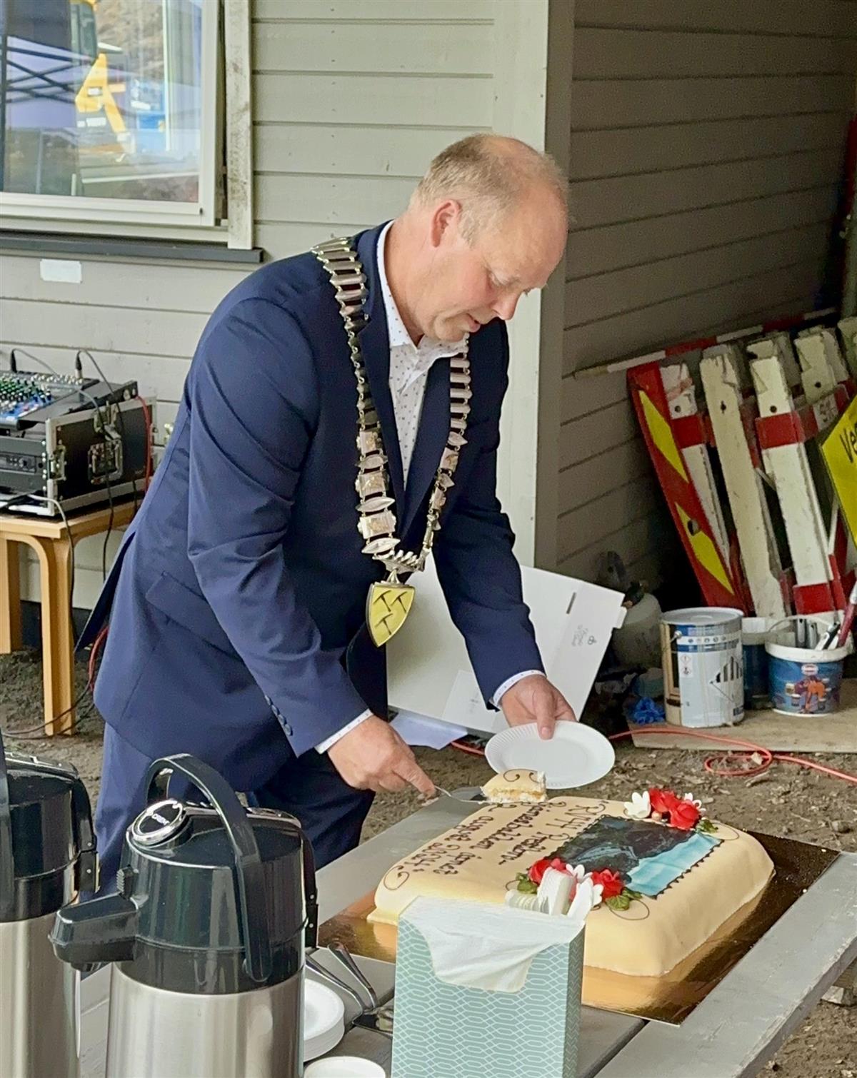 Ordføraren i Sokndal Bjørn-Inge Mydland fekk det fyste kakestykket.Auka trafikktryggleik og betre veg for tungtransport og annan trafikk