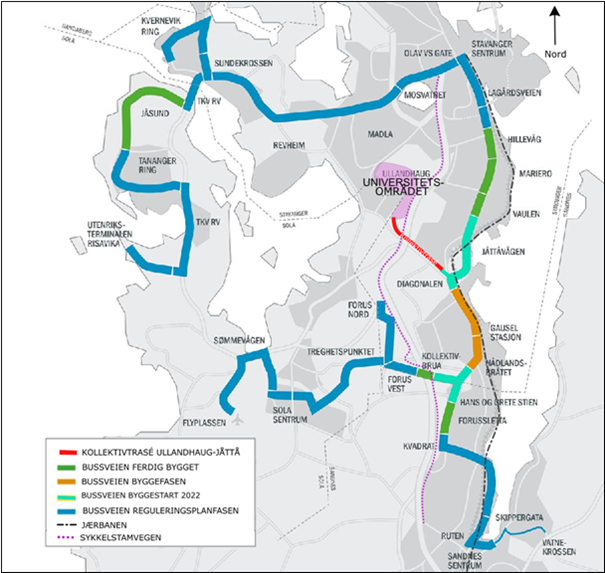 Kollektivtraséen mellom Ullandhaug og Jåttå er en del av Bymiljøpakken, og et rekkefølgekrav til det nye sykehuset, Stavanger Universitetssykehus. For å holde fremdriften i prosjektet, anbefaler fylkesdirektøren at fylkestinget godkjenner prosjektet på møtet i april.