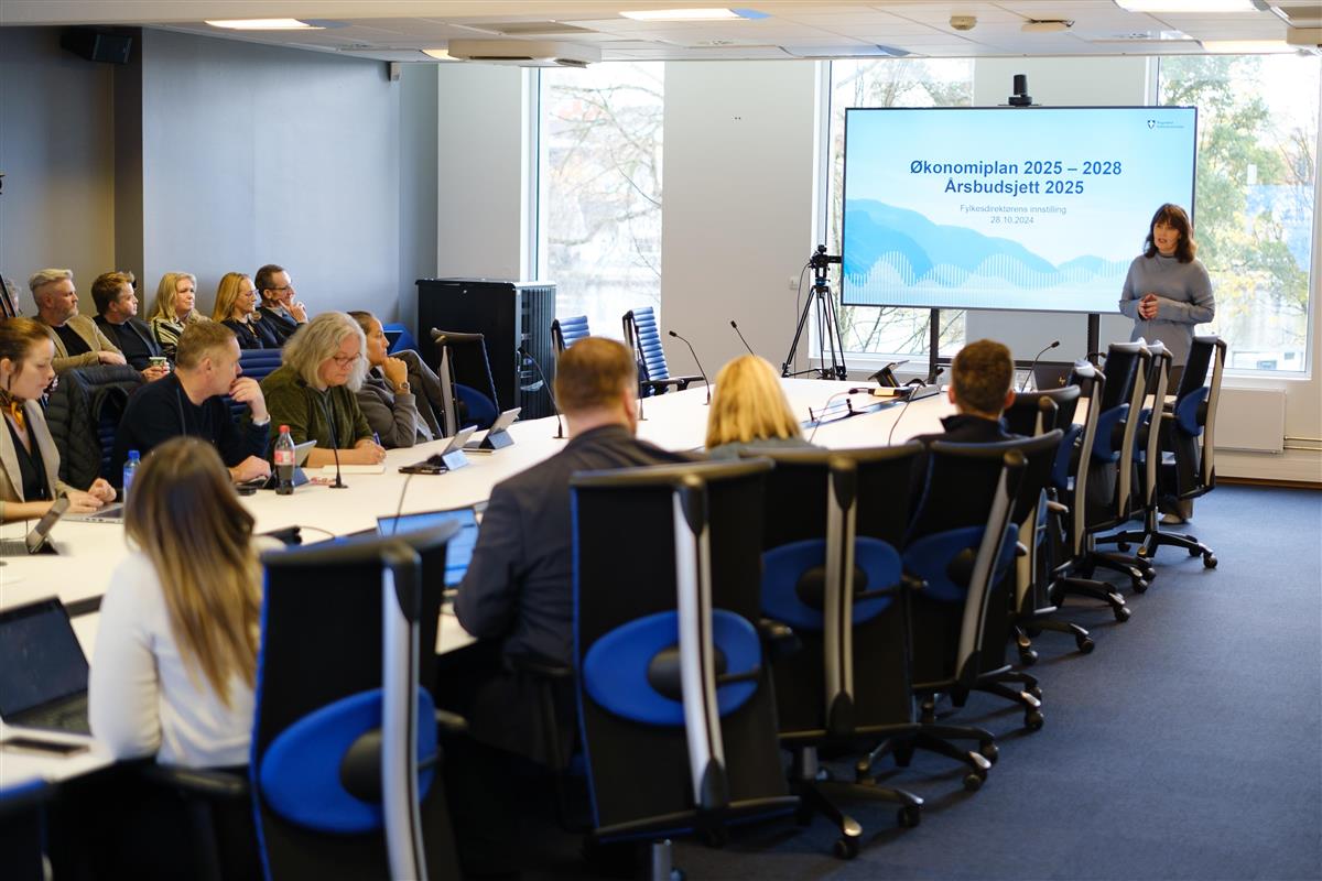 Fra presentasjonen av forslag til budsjett og økonomiplan i fylkesutvalgssalen i Rogaland fylkeskommune.