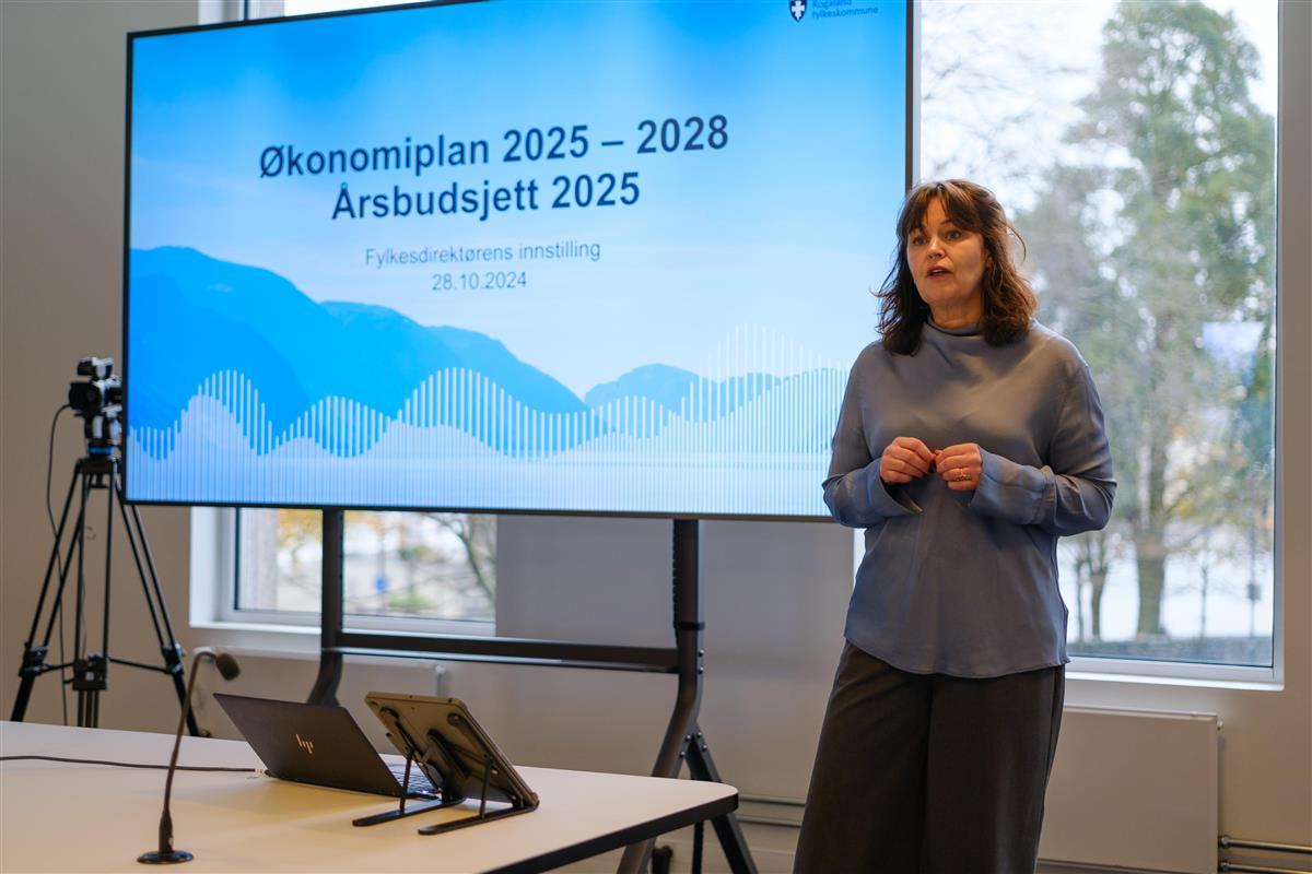 Fylkesdirektør Gunn Claire Westad under presentasjonen av forslag til budsjett for 2025 og økonomiplan 2025-2028.