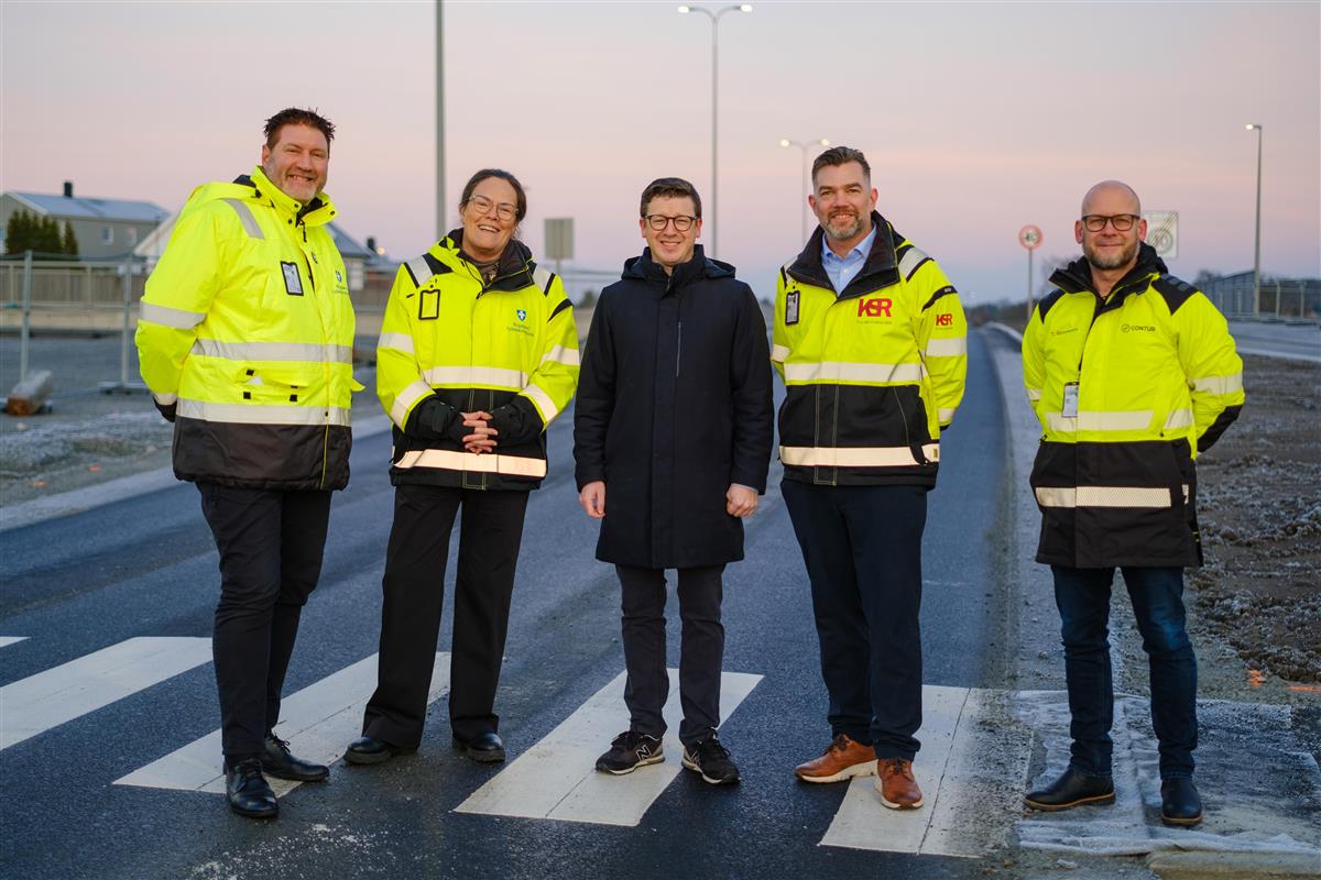Fem personer står på et gangfelt - Klikk for stort bildeF.v. Harald Bøhn (avdelingssjef samferdselprosjekt Rogaland fylkeskommune), Anne Margrethe Skretting (seksjonssjef Bussveien Rogaland fylkeskommune), Ole Ueland (Fylkesordfører i Rogaland), Tommy Emil Karlsson (prosjektleder Risa AS) og Trond Reinertsen (prosjektleder Contour). Øyvind Nesvåg
