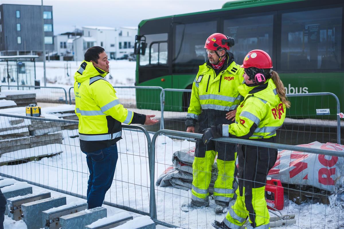Byggeleder Sjur Stangeland (i midten), sammen med Lutfi Turan og Stine Reed, jobber i prosjektgruppen som har ansvar for ombyggingen av stasjonsområdene og de nye leskurene på Bussveien.