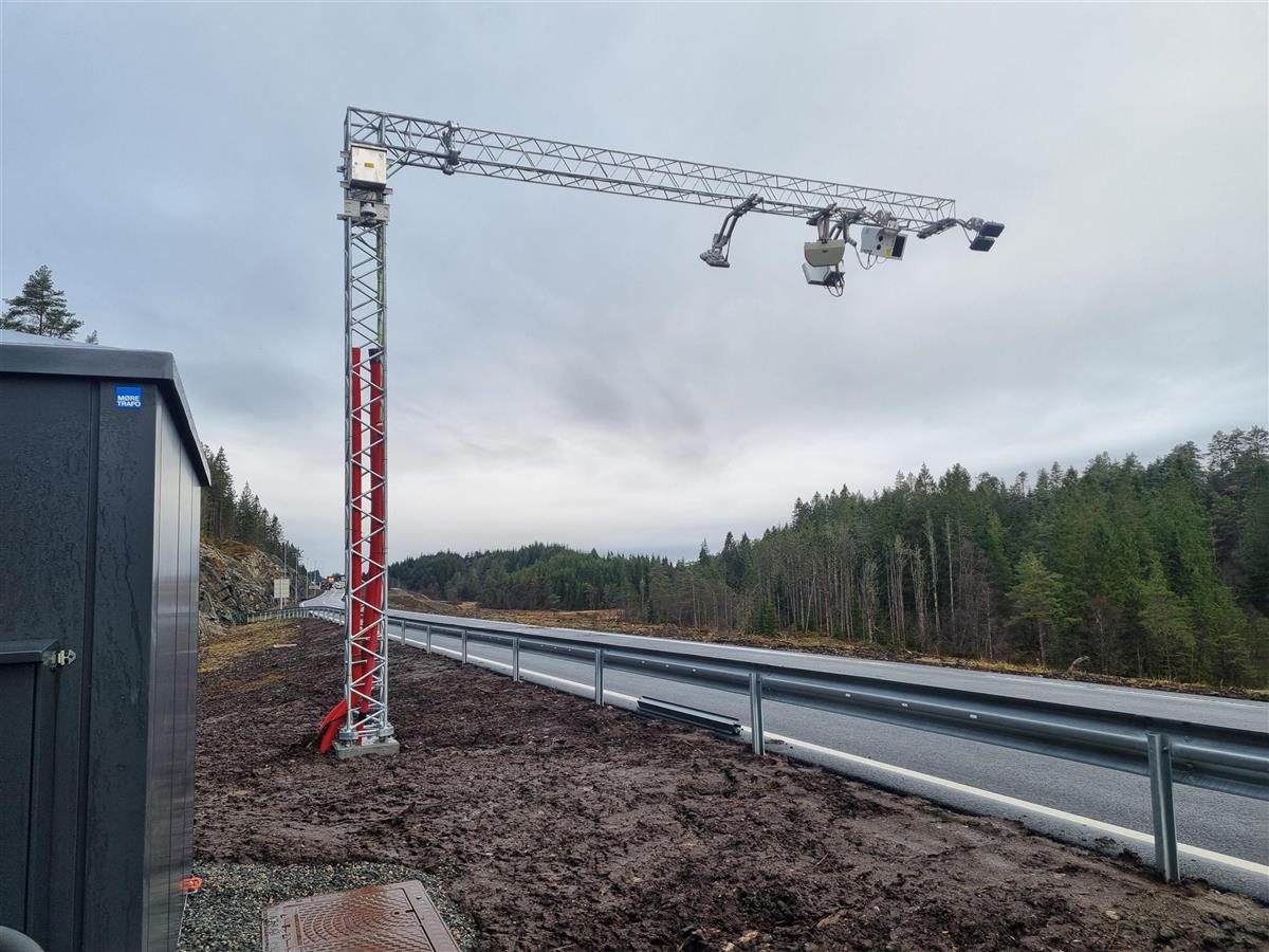 Her er et eksempel på halvportal. Den kan registrere biler som passerer begge veier. En helportal går over begge kjørefeltene og er fastmonter til bakken i begge ender.– Alle portalene blir satt opp om natten. På noen bomstasjoner kommer helportal, mens andre får halvportal. Der vi bygger helportal blir veien helt stengt noen timer, mens arbeidet pågår, sier prosjektleder i Rogaland fylkeskommune Gro Osmundsen Kyvik.