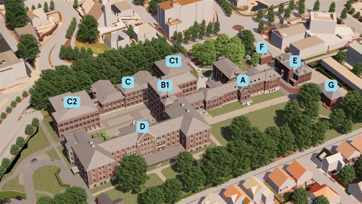 Bygg A, C og D vil rehabiliteres, samtidig som det oppføres to nybygg, B1 og C1. C2 er det ikke satt av midler til på nåværende tidspunkt, men bygget kan oppføres senere. Bygg E, F og G settes av til Akropolisvisjonen.