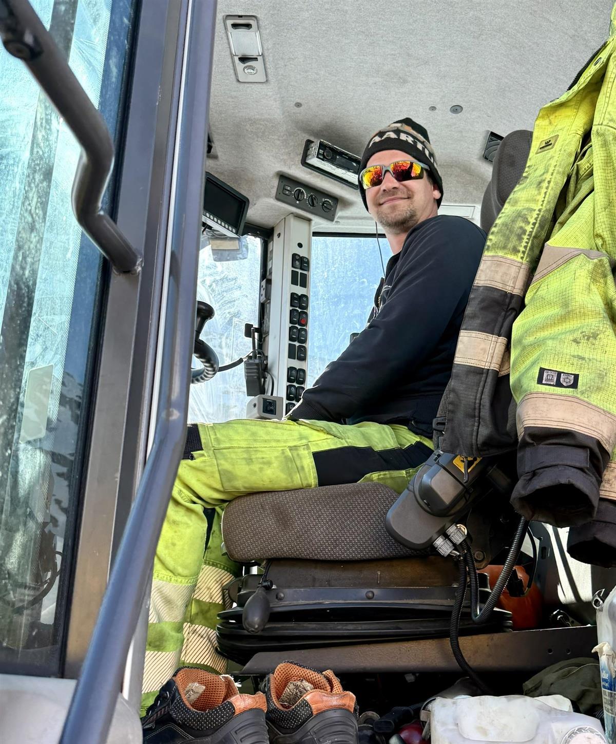 Anders Selvik i Aartun transport AS. Han gleder seg hvert år til jobben med å frese opp veien over Saudafjellet. Det er lite bråk i førerhuset og ganske behagelig å sitte der inne, forteller han.Før fjellveien kan åpne 15. mai, skal geolog i fylkeskommunen sjekke fem rasutsatte punkter. Når det ikke lenger er fare for “kalving”, altså at snøkanten raser ut i veien, kan veien åpne. Saudafjellet ble ferdig freset mandag 27. april men åpner ikke før 15. mai fordi det er noen reparasjoner som må gjøres uten biltrafikk på veien.