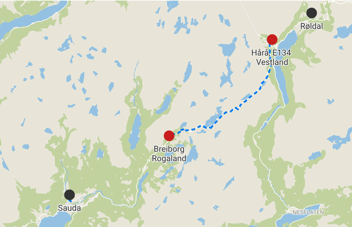 Blå stiplet linje viser fjellveien
