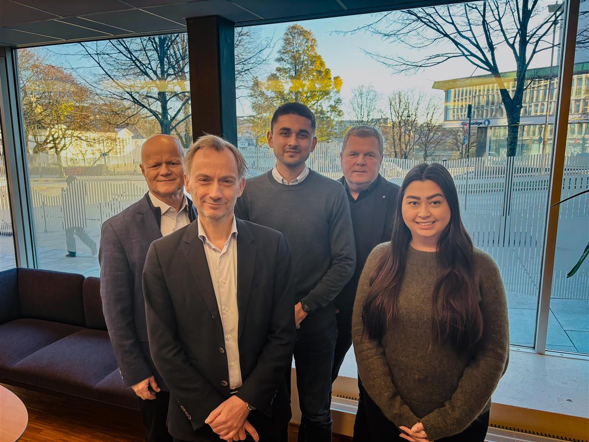 Styret i Ulla-Førrefondet samlet i foajeen.  - Klikk for stort bildeStyret i Ulla-Førrefondet består av f. v. Kjetil Harestad (Sunnhordland Kraftlag), Leif Harald Jensen (Lyse), Jonas Andersen Sayed (styreleder, Rogaland fylkeskommune (KrF)), Asle Rafdal (Rogaland fylkeskommune (Ap)) og Anne Marie Lund (Rogaland fylkeskommune (H)).