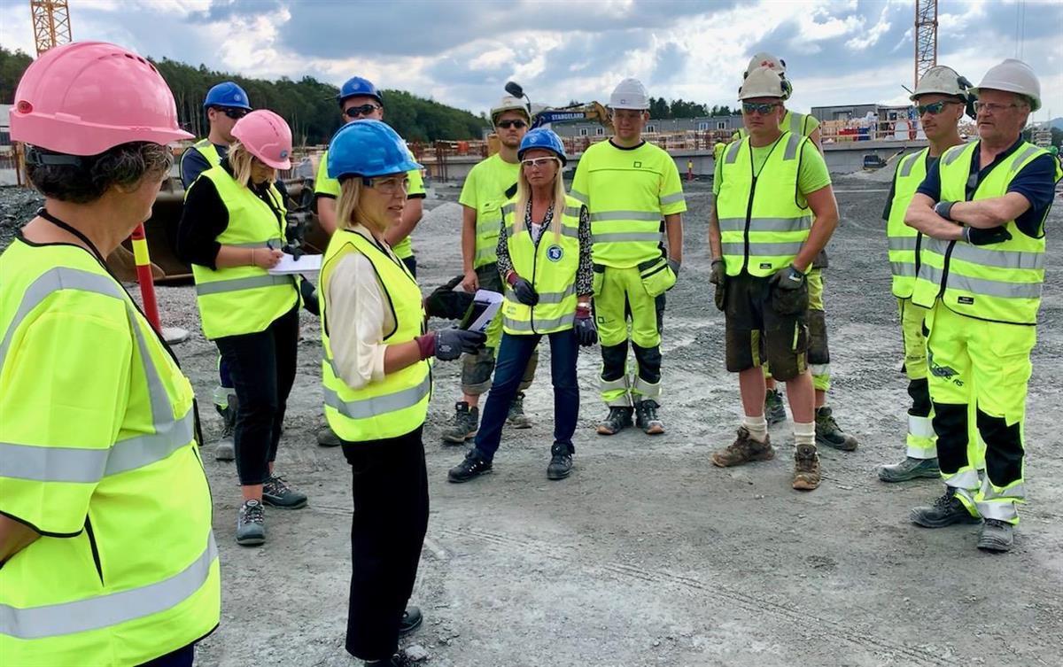 Fylkesordfører Marianne Chesak i engasjert samtale med entreprenører og lærlinger på byggeplassen til nye Stavanger universitetssykehus.