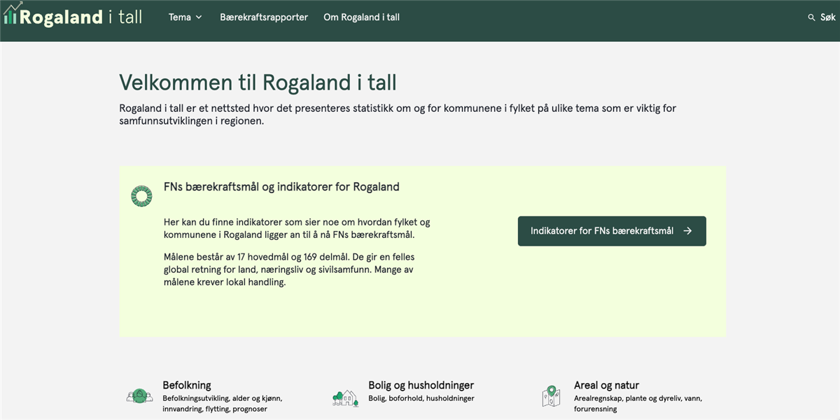 Slik ser forsiden på den ferske statitistikkportalen Rogaland i tall ut.Kommunene får egne bærekraftsrapporter