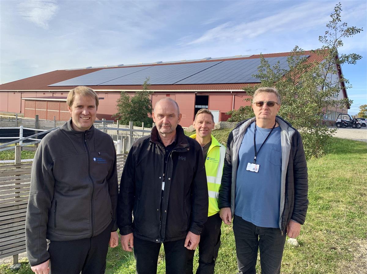Solcellepanelet ligg på taket til skolen sin ridehall. På bildet frå venstre ser du Jahn Viland som er driftsleiar, seksjonssjef for eigedom Steinar Håland, driftsoperatør Trond Vigre (bak) og områdeleiar i bygg- og eigedomsavdelinga Svein Magne Mathiassen.