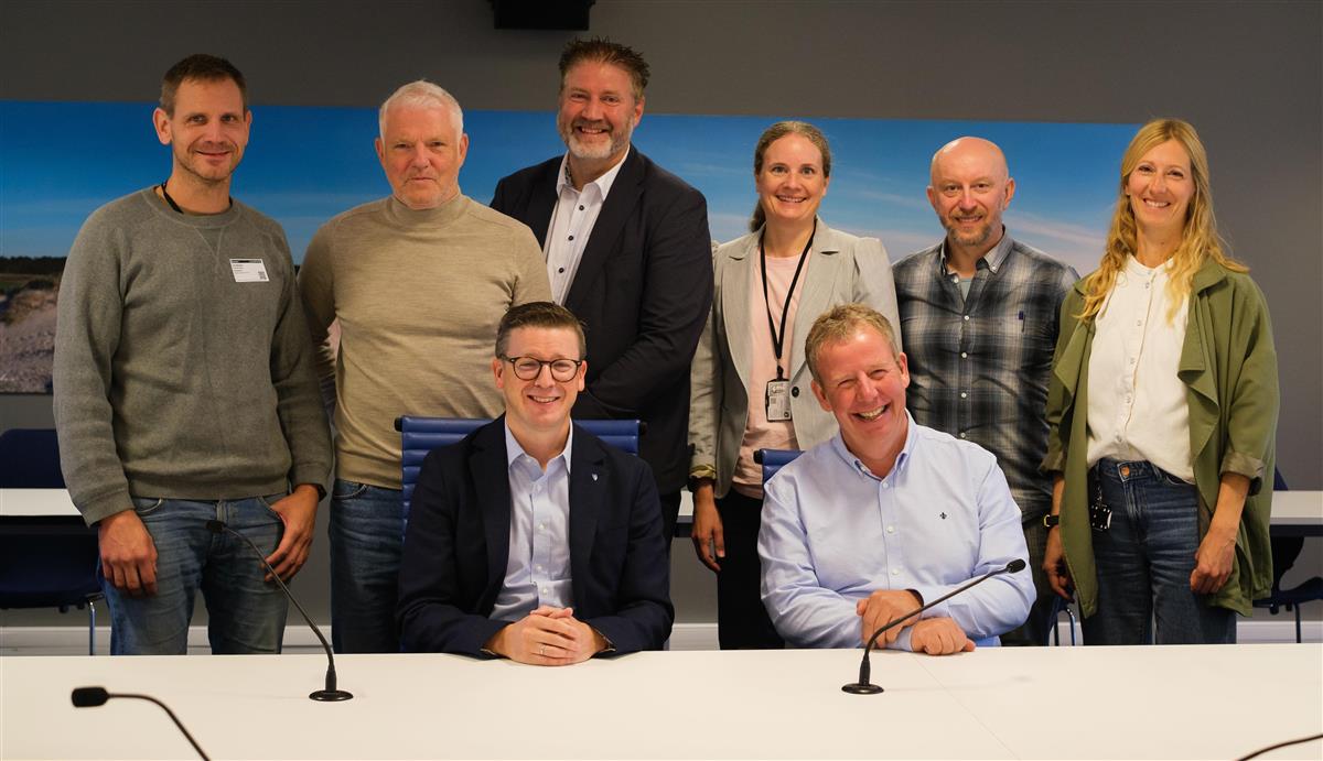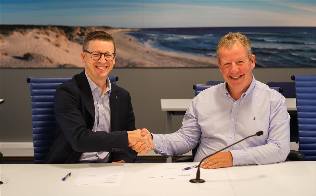 Fylkesordfører Ole Ueland (t.v.) og Tommy Stangeland daglig i Stangeland Maskin AS (t.h.) signerte kontrakten.
