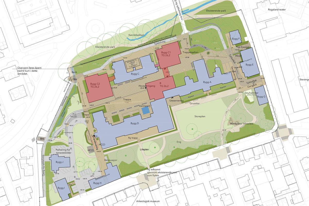 Plankartet viser tenkt plassering av de tre nye byggene (skravert i rødt) og området rundt fylkeshuset.