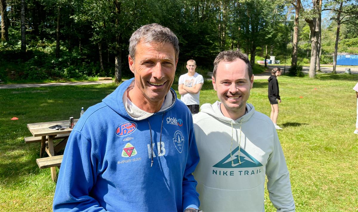To menn kikker inn i kamera, med elever i bakgrunnen. - Klikk for stort bildeLærerne Klaus Beschel og Andreas Vindenes har hatt ansvar for undervisningen i kroppsøving ved Bryne videregående skole de to første ukene av sommerferien. Thor Erik Waage