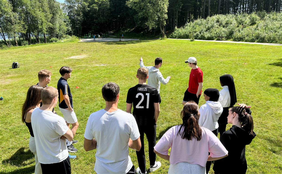 Flere ungdommer står med ryggen til og peker utover en grønn gressplen. - Klikk for stort bildeElevene har hatt kroppsøving fra 9-15 hver dag i to uker på sommerskolen. Thor Erik Waage