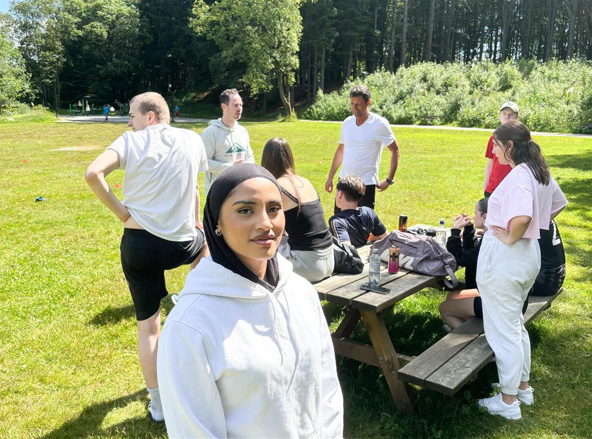 Ung kvinne står foran et bord på en gressplen med flere ungdommer sitter rundt.  - Klikk for stort bildeMaryam Naeem tok kroppsøving på Bryne videregående skole under årets sommerskole. Thor Erik Waage