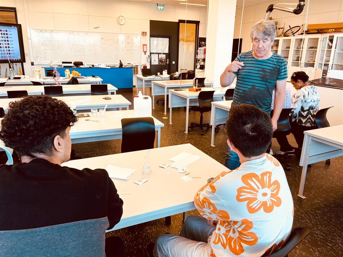 Lærer forklarer til elever som sitter ved pult.  - Klikk for stort bildeUndervisning i naturfagslaben ved Bryne videregåande skule. Alle som tok naturfag på sommerskolen besto eksamen. Thor Erik Waage