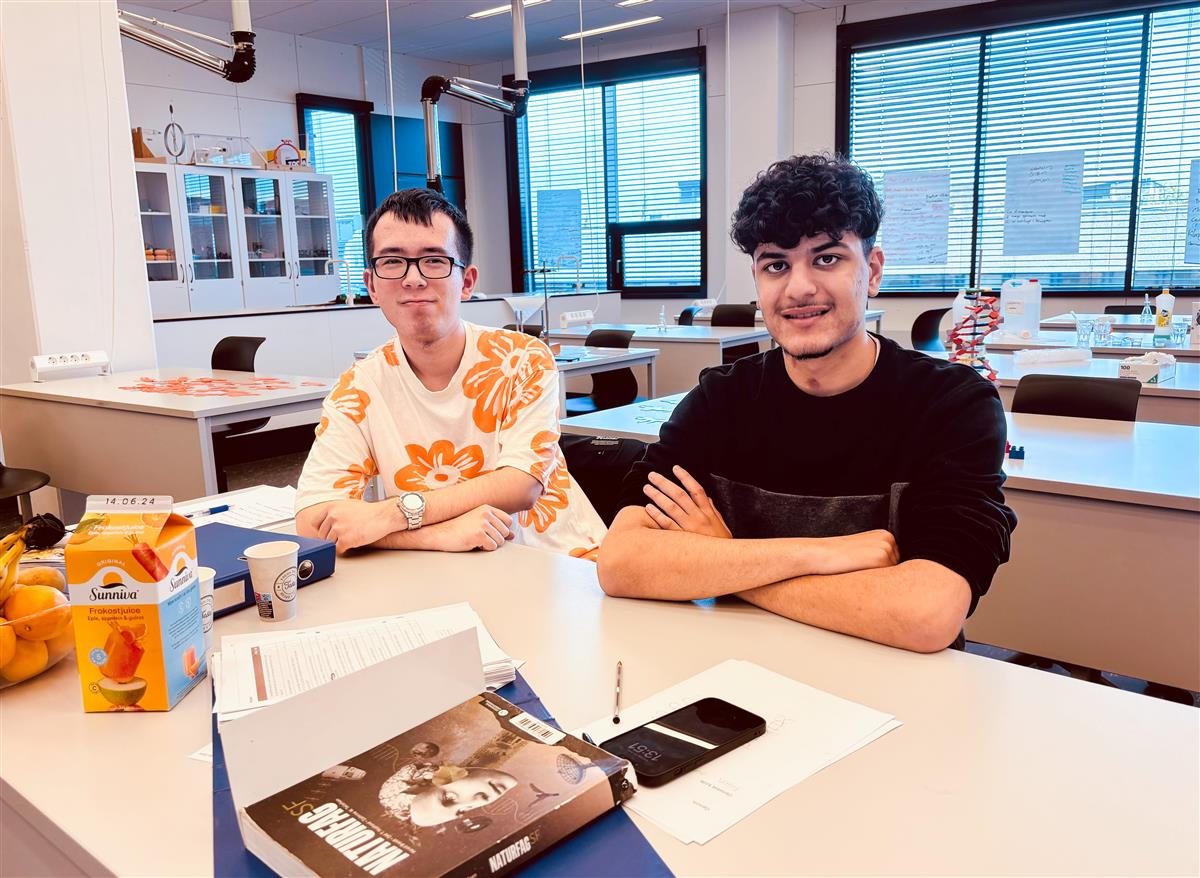 To elever ved en pult, ser inn i kamera.  - Klikk for stort bildeOmar Nader Abdulrahim og Marius Ellingsen i naturfagslaben på Bryne videregåande skule. Thor Erik Waage