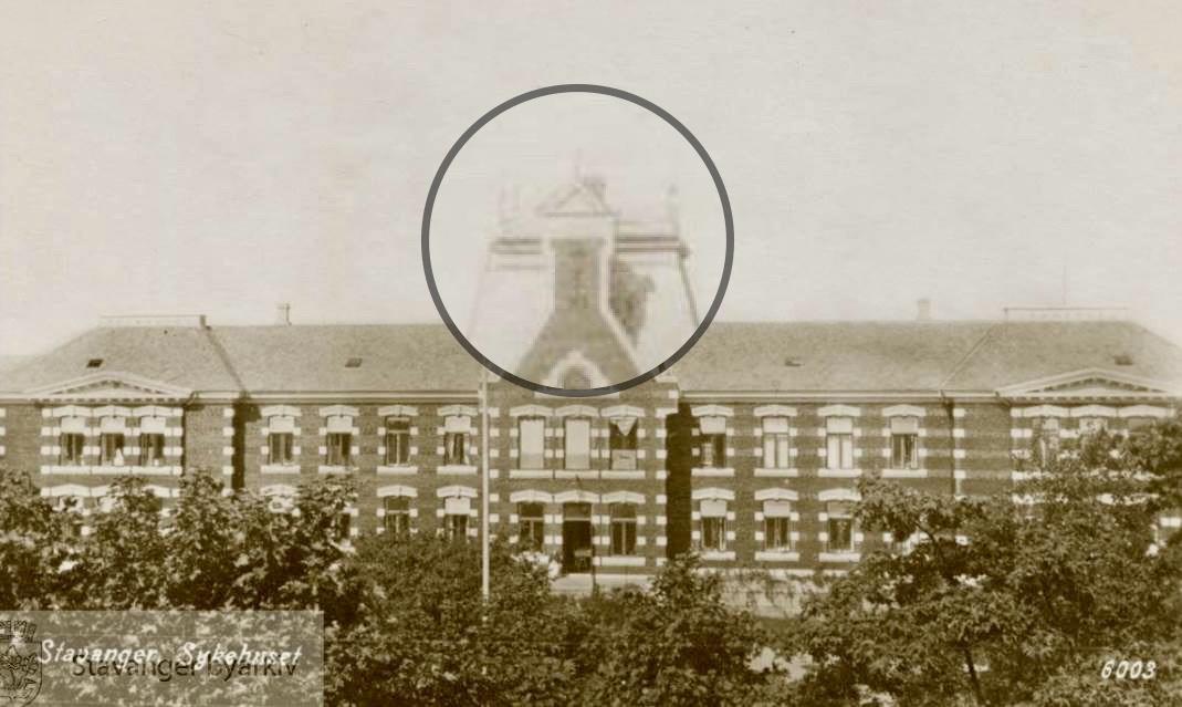 Toppen av gavlen, over fylkesrådmannen sitt kontor, mangler i dag. Den skal bygges opp på ny og se ut som på det gamle bildet under.