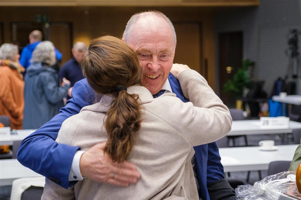 Arne Bergsvåg får klem av partikollega Hanne Marte Vatnaland i sitt siste fylkesting. Vatnaland fortsetter.