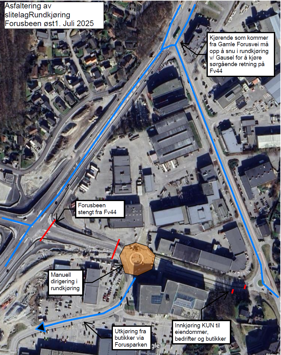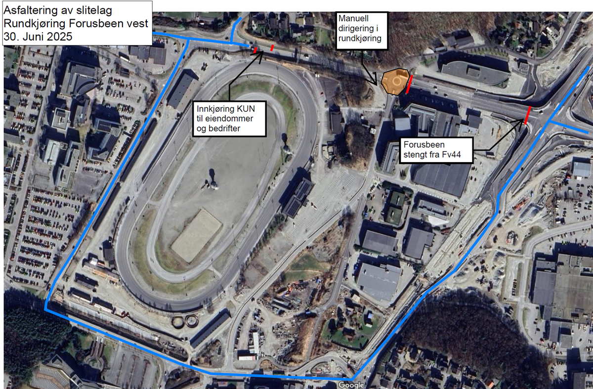 Bussveien Forus - manuell dirigering og trafikkomlegging uke 27Fra og med mandag 30. juni til og med onsdag 2. juli skal de tre rundkjøringene i Bussveiprosjektet mellom Nådlandsbråtet og Hans og Grete stien på Forus øst asfalteres. Da blir det manuell dirigering i rundkjøringene og omlegging av trafikken i området. Publisert av Øyvind Nesvåg Publisert 27.06.2025 11.47 Dette er de tre rundkjøringene som skal asfalteres på Forus øst i uke 27.Det tar én dag å asfaltere hver av rundkjøringene.Arbeidet utføres på dagtid og starter tidligst kl 08.30. Arbeidet fortsetter ut dagen til rundkjøringen er ferdig asfaltert.Mens arbeidet pågår må trafikanter dessverre forvente noe tregere trafikkflyt i området. Vi oppfordrer de som kan til å velge andre kjøreruter og ellers beregne god tid om en må kjøre gjennom området disse tre dagene.Når asfalteres rundkjøringene?Mandag 30. juni – Forusbeen VestForusbeen er stengt fra fylkesvei 44 og frem til rundkjøringen inn til Nådlandsbråtet/Bjødnabeen. Tirsdag 1. juli – Forusbeen ØstForusbeen øst stenges fra fylkesvei 44 og frem til rundkjøringen inn til Obs Bygg Forus. Skal man til butikkene og bedriftene på andre siden av rundkjøringen må man kjøre inn via Gamle Forusvei.Onsdag 2. juli – LøwenstrasseLøwenstrasse stenges fra fylkesvei 44 og frem til innkjøring til Torvmyrå. Midtbergmyrå åpnes for biltrafikk denne dagen.