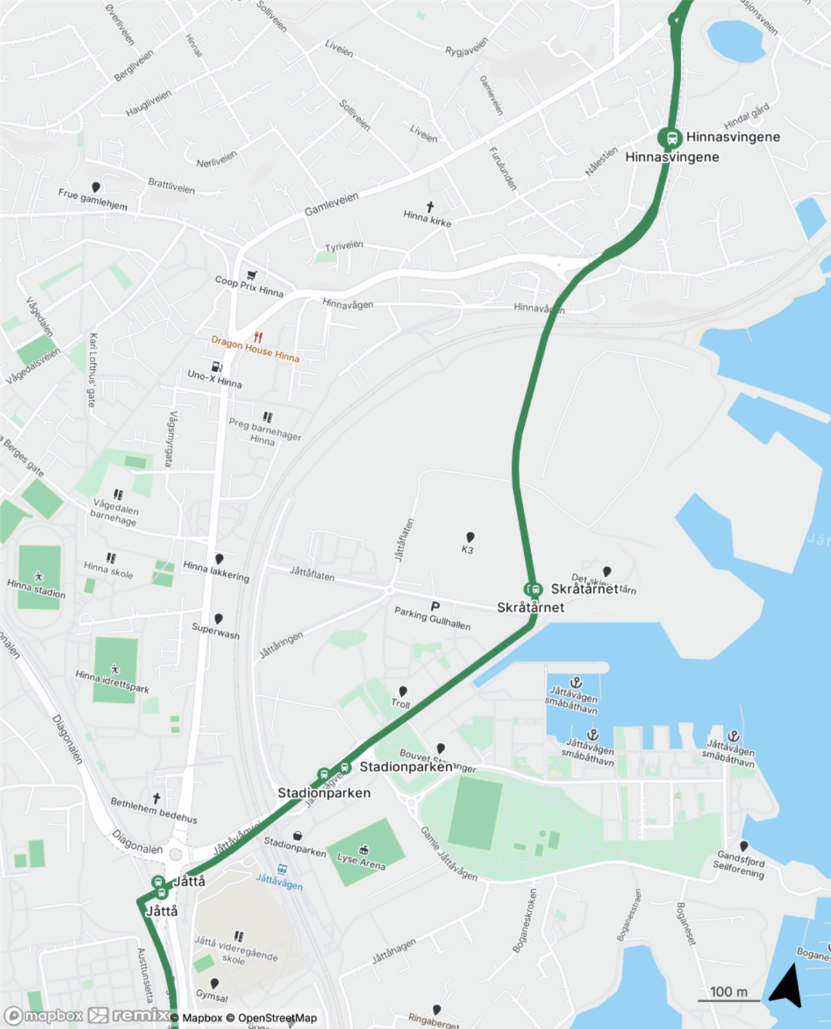 • Ny trasé: gjennom Hinnasvingene, bro ved Hinnavågen, Jåttflaten og lokket ved Jåttå