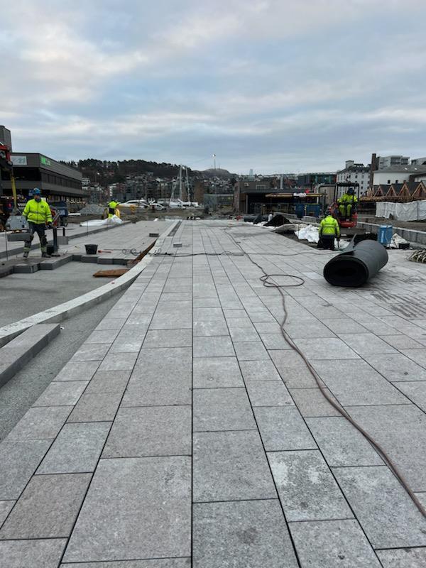 For å dekke heile området trengst seks tusen kvadratmeter med granitt. Arbeidet med steinlegginga starta første veka i november, i undergangen ved jernbanen.