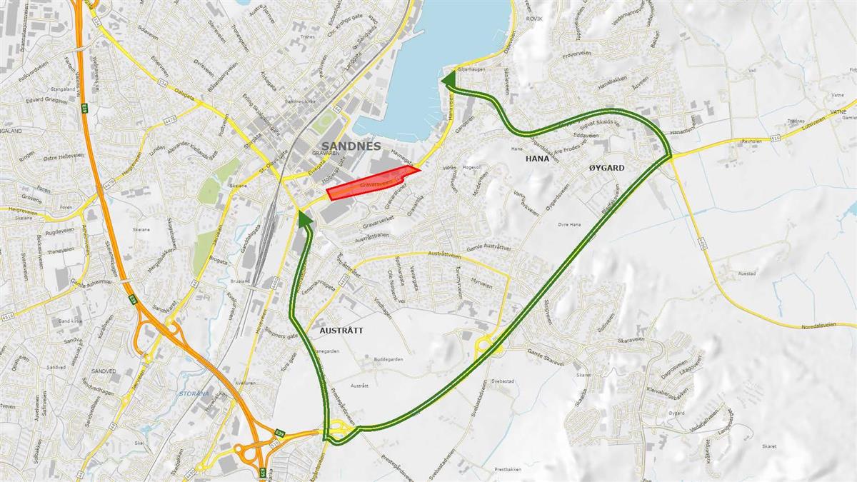 Kartet viser alternativ rute mellom Gravarsveien nord/Daleveien og Gravarsveien sør når Gravarsveien stenges (grønne streker). Arbeidsområdet i Gravarsveien er tegnet inn med rød skravering.– Hvis du kommer fra Sandnes øst eller Dalesiden/Hana, og skal forbi Sandnes sentrum, oppfordrer vi at du kjører via fylkesvei 516 Lutsiveien over Austrått. Skal du til sentrumskjernen av Sandnes vil det være mulig å benytte seg av den lokale omkjøringsveien via Havnegata. Vi håper at alle følger anbefalingene våre, slik at det ikke blir mer biler enn nødvendig i sentrum og på de mindre veiene i området, sier prosjektlederen.