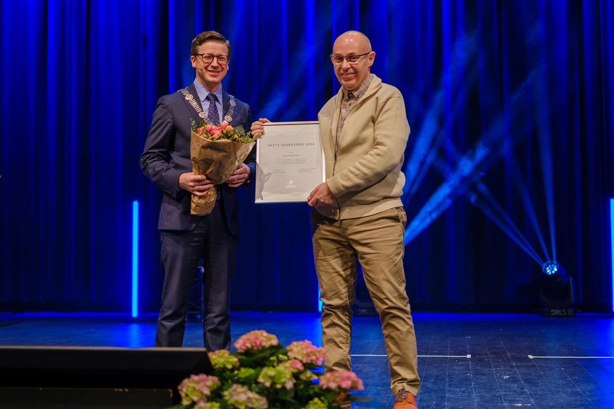 Fylkesordfører Ole Ueland deler ut prisen årets hederspris til David Knutsen.