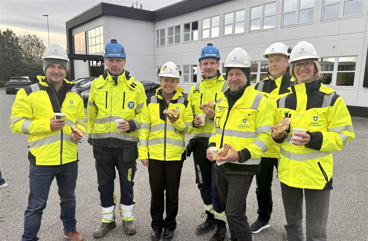 Entreprenør Stangeland Maskin AS og ansatte i Rogaland fylkeskommune feirer første spadestikk med gode boller