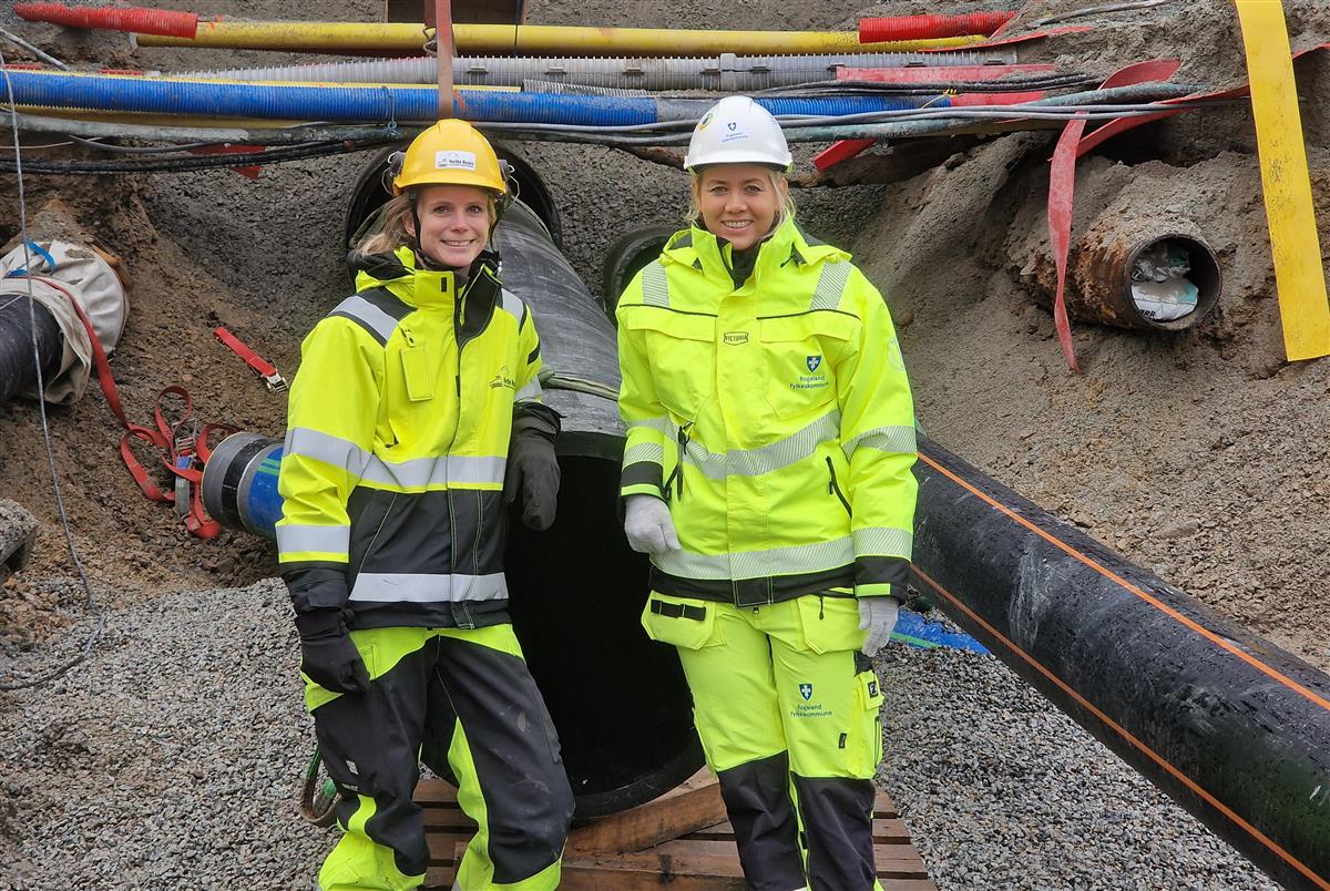 Prosjektleder for entreprenør Nordbø Maskin AS, Solveig Espedal Walskaar (t.v.) og prosjektleder for Bussveien i Strandgata, Åsne Nord-Varhaug (t.h.) er godt fornøyde med at arbeidet med avløpsledningen har gått så bra.