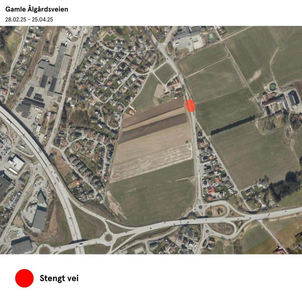 Stenger deler av Gamle Ålgårdsvei i åtte ukerI forbindelse med prosjektet Prestegårdsveien, starter vi utskifting av en skadet undergang (kulvert) på Gamle Ålgårdsvei. Deler av veien vil derfor være stengt fra 28. februar 2025 til 25. april 2025. Publisert 26.02.2025 12.10 Arbeidet innebærer at den eksisterende undergangen erstattes med en ny stedstøpt platebru. Entreprenør Risa har allerede begynt å sette ut skilt for å varsle om veistengingen. Risa tar kontakt med grunneiere og naboer som blir spesielt berørt i anleggsperioden.