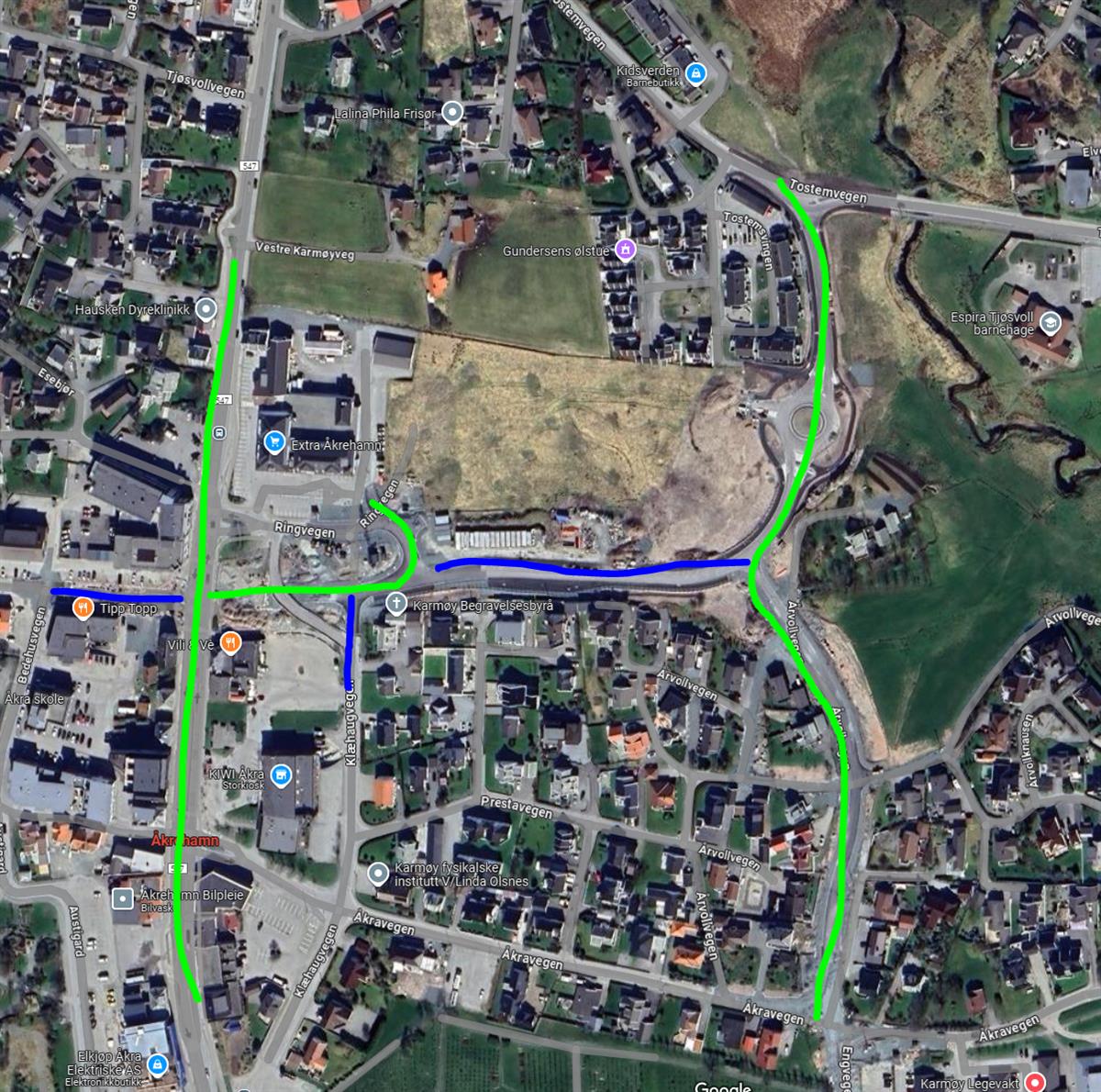 Grønn er veier som blir åpnet først og blå er veier som vil åpnes litt etterpå.Først åpner Vestre Karmøy veg og ny vei mellom Tostemsvegen og Åkravegen. Sideveier som Rådhusvegen og Klæhaugvegen er stengt litt lenger, til de er klare til å bli åpnet. Når Vestre Karmøyveg åpner, blir Klæhaugvegen stengt en periode, slik at entreprenøren kan gjøre seg ferdig med denne veien.