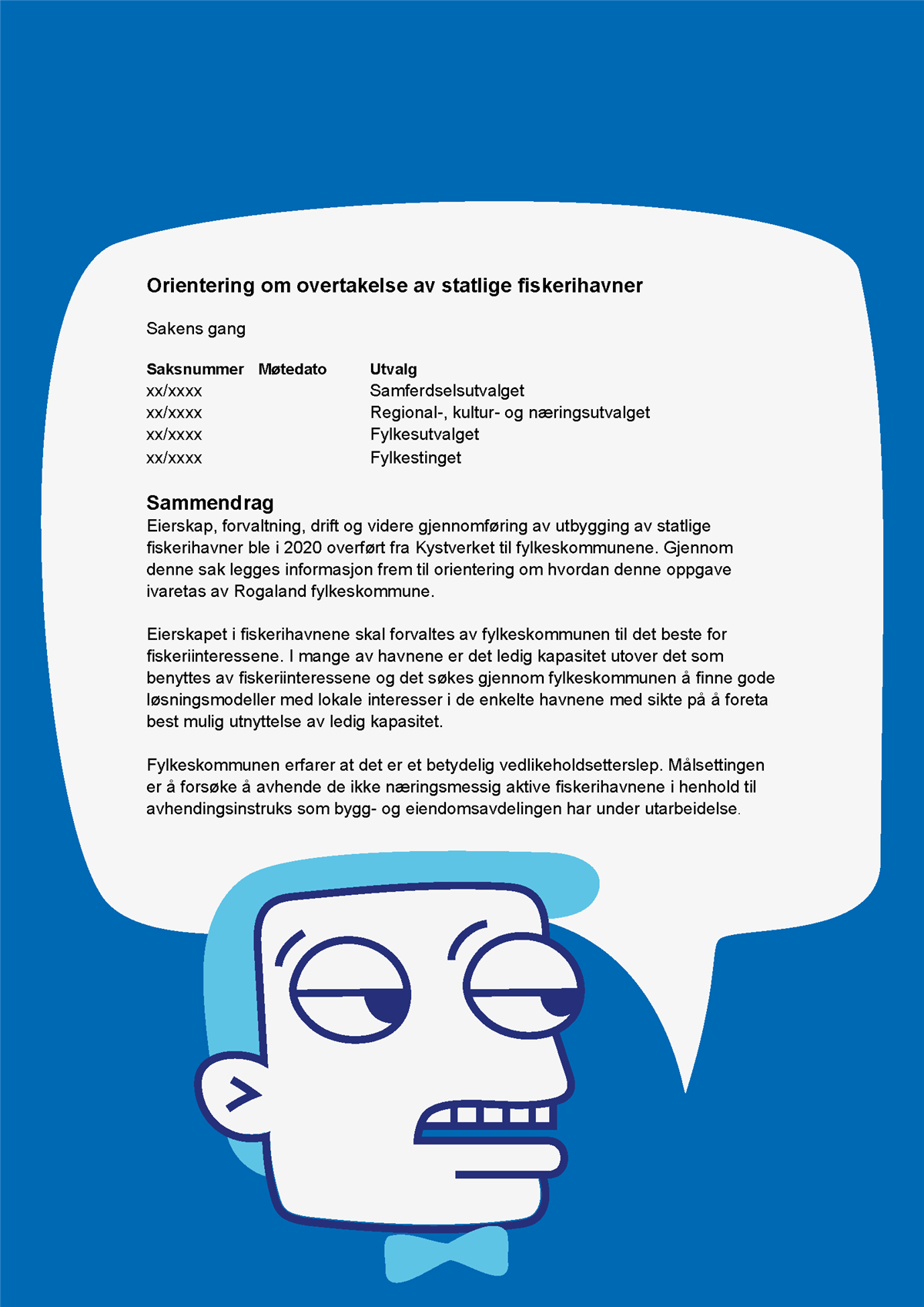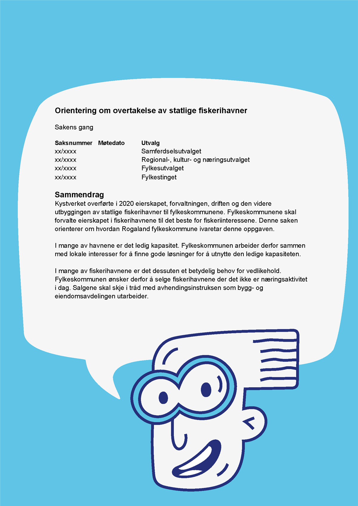 Eierskap, forvaltning, drift og videre gjennomføring av utbygging av statlige fiskerihavner ble i 2020 overført fra Kystverket til fylkeskommunene. Gjennom denne sak legges informasjon frem til orientering om hvordan denne oppgave ivaretas av Rogaland fylkeskommune.