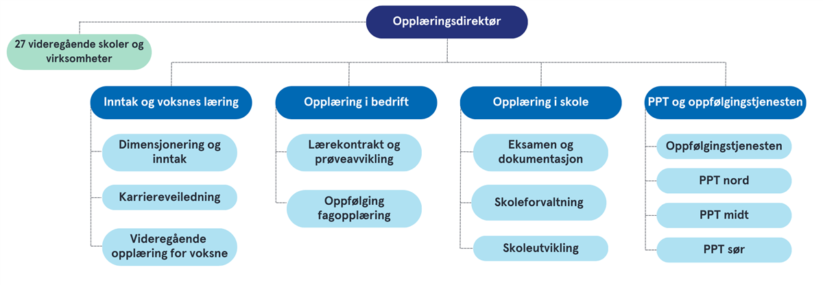 OpplæringVidaregåande skole og opplæring i bedrift er en svært viktig arena for å forberede unge – og en del voksne – på vidare studier og arbeidsliv. Vårt mål er at alle elever og lærlinger skal fullføre og bestå vidaregående opplæring.Avdeling opplæring i skoleAvdeling opplæring i skole skal støtte skolene i den daglige driften samtidig som den skal være pådriver for skoleutvikling iht. nasjonale, og lokale satsingsområder. Avdelingen skal være bindeleddet opp mot nasjonale føring og retningslinjer. Seksjon eksamen og dokumentasjonSeksjonen bidrar med rådgiving og avklaringer rundt tolking av opplæringsloven rundt eksamen, administrering, støtte og gjennomføringen av elev og privatisteksamen i skole og for privatister, og dokumentasjon.Seksjon skoleutviklingSeksjonen har en tett dialog med skolene. Seksjonen har ansvar for gjennomføring av rektorsamlinger, innspill til rektormøter og rektorenes arbeidsutvalg. Andre oppgaver er blant annet oppfølging av kvalitet i skolen, etter- og videreutdanning, fagnettverk, overgang grunnskole/videregående skole, helhetlig fag- og yrkesopplæring, fengselsundervisning, og særskilt språkopplæring.Seksjon skoleforvaltningSeksjonen har ansvar for å følge opp de videregående skolene innenfor blant annet opplæringsloven, de skoleadministrative systemene, internasjonalisering, digitale utviklingsområder som bruk av kunstig intelligens i skolen, pc ordning og Visma in school, oppfølging av elever innenfor barnevern, skolebibliotek, individuell tilrettelagt opplæring, beredskap i skolene og oppfølging av statlige tilsyn. Avdeling opplæring i bedriftAvdeling opplæring i bedrift skal sikre at Rogaland forblir et robust fagopplæringsfylke. Dette skal skje i godt samarbeid med arbeids- og næringsliv, partene i arbeidslivet, skolene og opplæringskontorene. Arbeidet har tre bærebjelker; 1) formidling av læreplasser, 2) oppfølging av lærling og bedrift gjennom læretiden og 3) prøveavvikling. Seksjon oppfølging fagopplæringSeksjonen har ansvar for å godkjenne og følge opp lærebedrifter, samt godkjenne opplæringskontorer. Seksjonen legger til rette for samarbeid med opplæringskontor, arbeids- og næringsliv, dialogmøter med opplæringskontor, kommuner og selvstendige lærebedrifter. Seksjonen arrangerer kurs for instruktører, faglige ledere og prøvenemndsmedlemmer, og følger opp lærlinger, lærekandidater og kvalitetssikrer opplæring i bedrift.Seksjon lærekontrakt og prøveavviklingSeksjonens oppgaver er godkjenning av lærekontrakter og opplæringskontrakter, oppnevning og oppfølging av prøvenemder, prøveavvikling, dokumentasjon fag-, svenne- og kompetansebrev mm. Skaffe læreplasser og administrere Vg3 fagopplæring i skole.Avdeling inntak og voksnes læringAvdeling inntak og voksnes læring skal sikre forutsigbar og god skoleutnyttelse, og dimensjonere tilbud i tråd med søkeres ønsker, næringslivets behov og skolenes kapasitet. Videre skal den sikre at ungdommers rett i forbindelse med inntak til videregående skole ivaretas, og at voksne deltakere får oppfylt sine rettigheter til videregående opplæring. Videre skal den sørge for karriereveiledning til fylkets innbyggere. Seksjon dimensjonering og inntakSeksjonens oppgaver er dimensjonering, samarbeid med opplæringskontor, samarbeide med økonomi og eiendom om skolebygg, leie av lokaler og fordeling av inventar og utstyr. Skolebruksplan, tilbudsstruktur, behandling av søkertall, inntak til videregående skole, inntaksteam, inntak og dimensjonering av minoritetstilbud og rapportering SSB elevdata.Seksjon videregående opplæring for voksneSeksjonens oppgave er inntak til voksenopplæringstilbud, samarbeid med opplæringskontor, godkjenning av tidligere utdanning, realkompetansevurdering og oppfølging av voksenopplæringssentrene samt administrering av diverse ordninger knyttet til voksne i samarbeid med NAV og kommuner.Seksjon karriereveiledningSeksjonens oppgave er å tilby karriereveiledning til alle innbyggere i Rogaland.Les mer om karriereveiledning.Avdeling PPT og oppfølgingstjenestenPPT og oppfølgingstjenesten skal sikre at Rogaland fylkeskommune ivaretar elevens rett til tilfredsstillende pedagogisk-psykologisk tjeneste (PPT). Oppfølgingstjenesten er også del av denne avdelingen. Seksjon PPT nord, midt og sørDe tre PPT-seksjonene har alle oppgaver som sakkyndig instans, gjør sakkyndige vurderinger og veileder skoler og lærebedrifter. De har videre oppgaver innen psykisk helse, individrettet arbeid med elev og lærlinger, samarbeid på skolene, systemarbeid på skolene, samarbeid med spesialisthelsetjenesten, kommunesamarbeid på individnivå, tidlig innsats, spesialundervisningsbehov på privatskoler, organisasjonsutvikling og kompetanseutvikling og sakkyndig instans for grunnskoleelever i SMI. Seksjonene har ansvar for sosialrådgivere og samarbeid med helsesykepleier. Seksjon oppfølgingstjenestenSeksjonen har ansvar for oppfølgingstjenesten (OT). Dette er en lovpålagt oppgave knyttet til veiledning av ungdom og unge voksne som er i fare for, eller har falt ut av, påbegynt opplæring. Utover seksjonens tre medarbeiderne er det 16 OT-rådgivere ute på skolene. Sist endret 21.10.2025 11.32