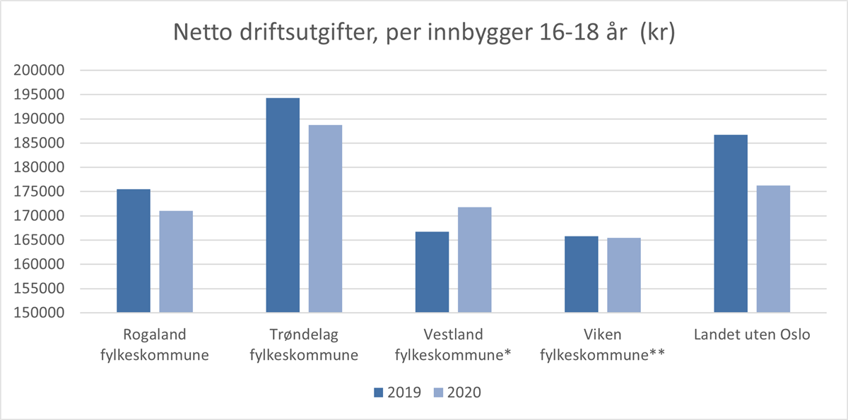 Rogaland ligger tre prosent under landsgjennomsnitt for netto driftsutgifter til videregående opplæring per innbygger 16–18 år (mot seks prosent i 2019). Objektivt utgiftsbehov for videregående opplæring (delkostnadsindeksen) var i overkant av 106 prosent av landsgjennomsnittet, målt per innbygger i hele fylket.
