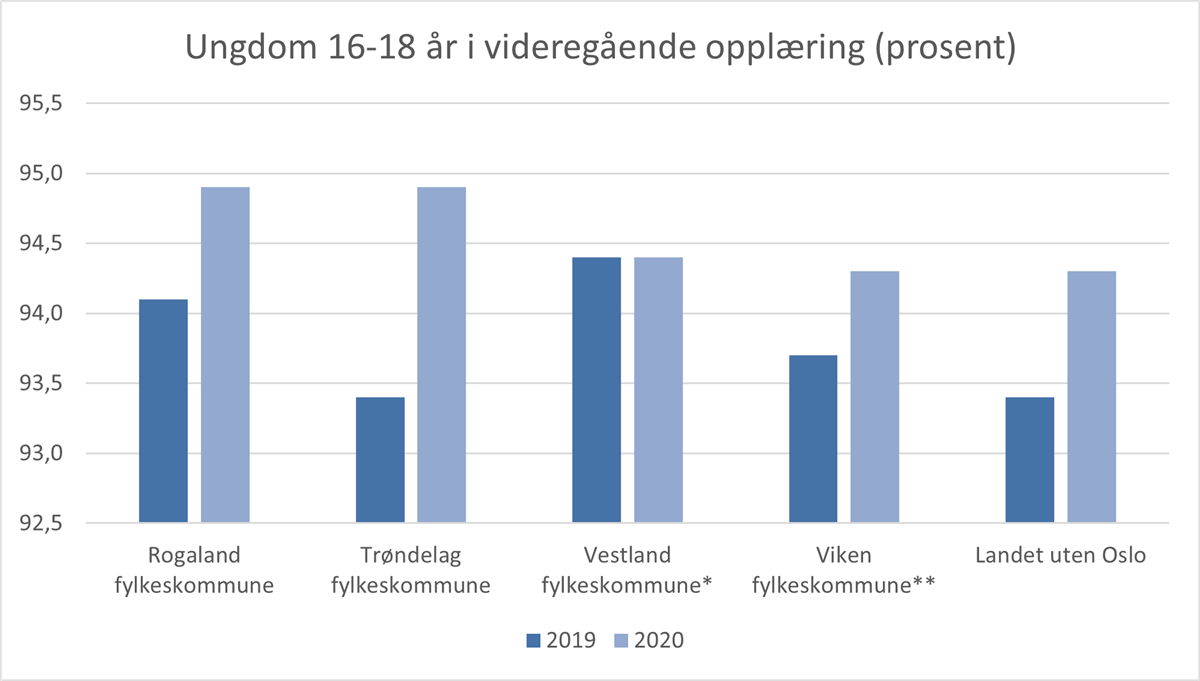 Andel av 16–18-åringer i videregående opplæring er høyere i Rogaland enn landsgjennomsnittet – 94,9 prosent i 2020 mot landsgjennomsnittet på 94,3 prosent.