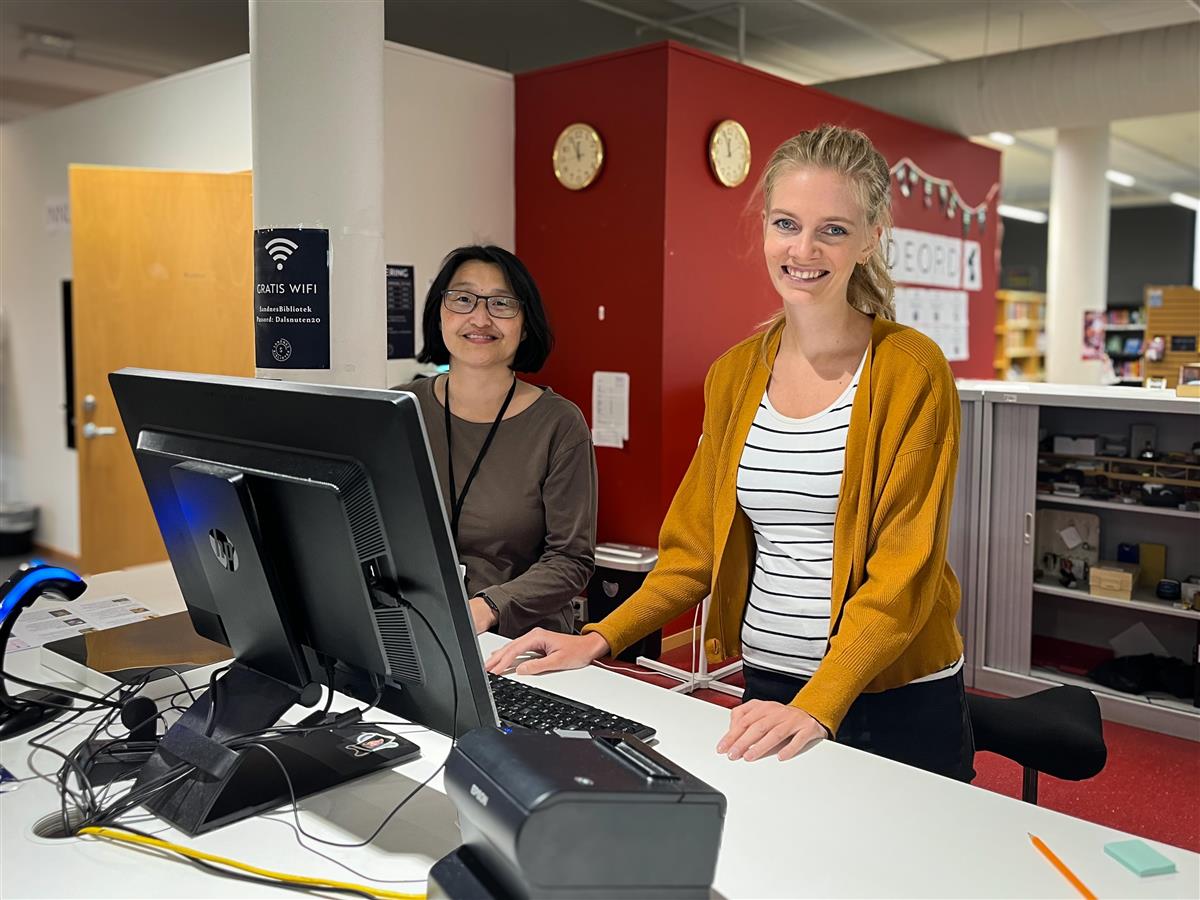 To damer som jobber på biblioteket i Sandnes - Klikk for stort bildeBibliotekarane Silje Ada Helgevold og Marie Håland ved Sandnes bibliotek.