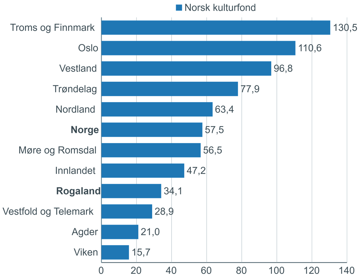 - Tildelinger fra nasjonale tilskuddsordninger: Rogaland kommer lavt uansett ordning, og uansett normalår eller ikke, med en åttende plass (2020, Frifond, tildelinger fra Riksantikvaren og Norsk kulturminnefond samt tildelinger fra Norsk kulturråd gjennom Norsk kulturfond).
