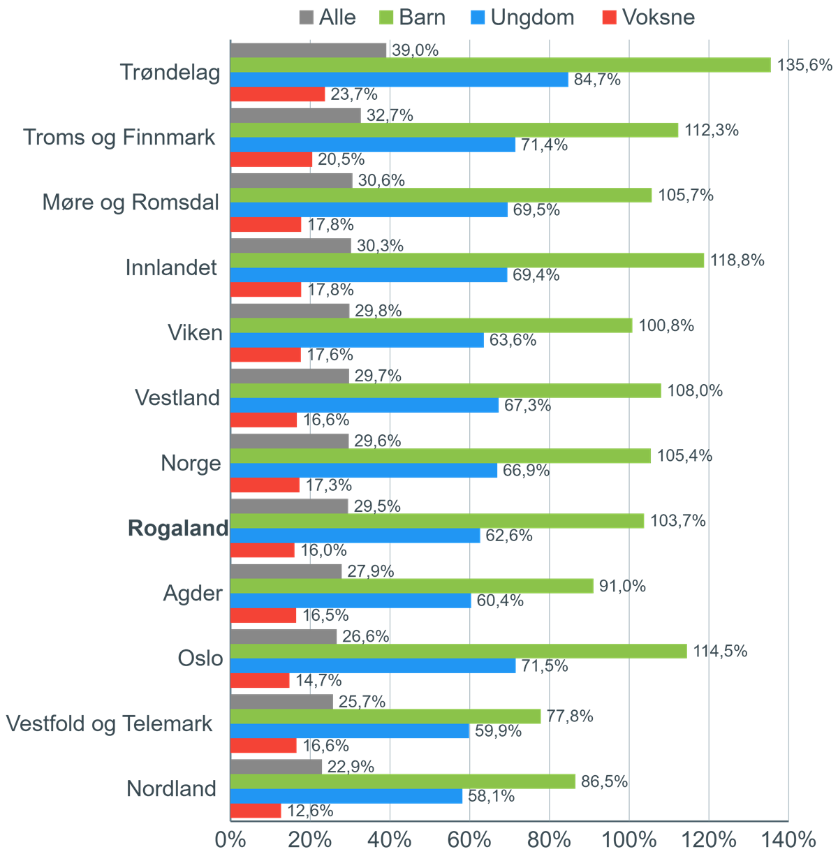 - Pandeminedgang: Fra 2019 til 2020 var nedgangen i aktivitetsandelen i Rogaland på 3,9 %, omtrent som på landsbasis (3,8 %).