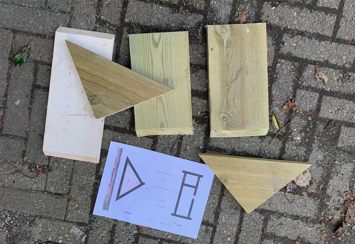 Dette er vårt forsøk på å lage dagsturhytte-fuglekassen: Farfar sagde de fem plankebitene vi trengte etter samme mål som på arkitekttegningen. Han hjalp oss også lage skrå vinkel (45 grader) på endene, på begge sider i gulvet og på nederste kant i de to "takplankene". Dette kan være litt komplisert uten gode verktøy, så det gir naturligvis rom for improvisering. (Vi er på ingen måte eksperter, men håper likevel å inspirere flere til å bygge fuglekasser.)