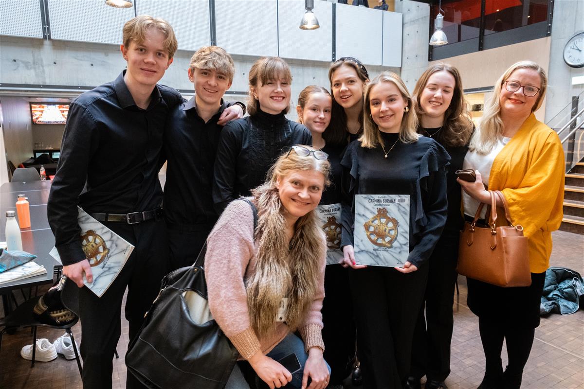Musikkelever fra Stavanger katedralskole, fra venstre Eivind, Morten, Lona, Iben, Elvis, Marte og Malene sammen med kordirigent Kateryna Ustyantseva og Kristin Storhaug, avdelingsleder ved Stavanger katedralskole.– For mange av elevene er det kanskje også et første møte med klassisk musikk og konserthuset. Vi håper det kan gi frukter i form av at morgendagens generasjon også finner veien inn i konserthuset, og til gleden av klassisk musikk. For mange blir det et minne for livet å kunne si at sto på denne scenen og framførte et helt klassisk mesterverk, sier Storhaug som ikke legger skjul på at hun er stolt på elevenes vegne.