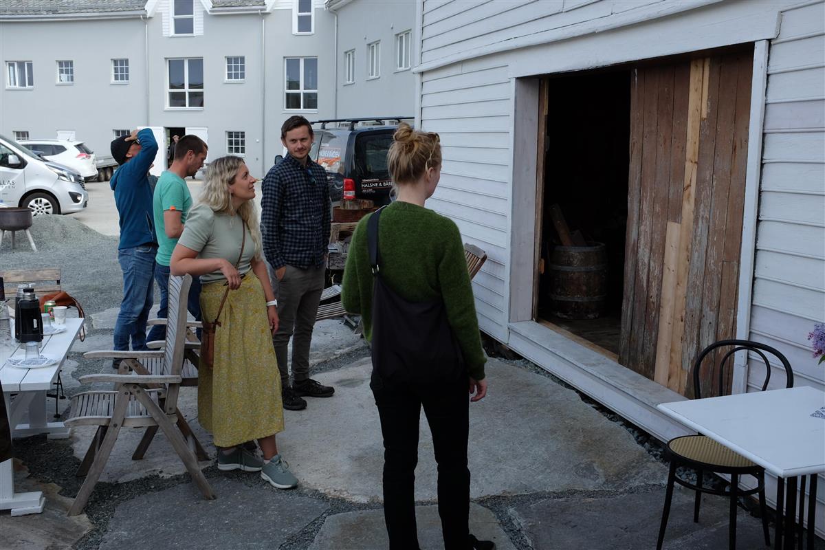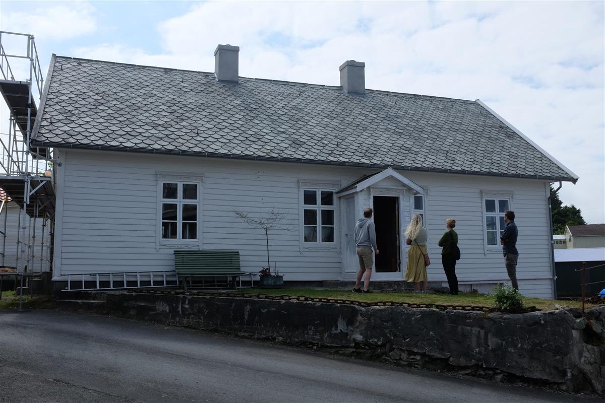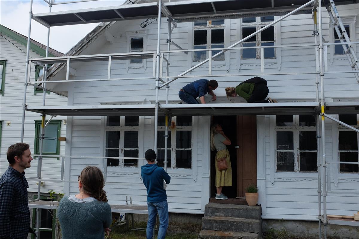 Ragna og Lars Bårdsen, begge i grønne t-skjorter på bildet, har fått besøk av konservatorer fra NIKU og ansatte i Karmøy kommune og Rogaland fylkeskommune for å se nærmere på hva slags farger som kan ha vært på huset.Til daglig er det gjerne store oppdragsgivere som Statsbygg som engasjerer NIKU til å gjøre disse undersøkelsene. Et enkelt hus utenfor fredningsmiljø i privat eie er ikke en vanlig oppgave.