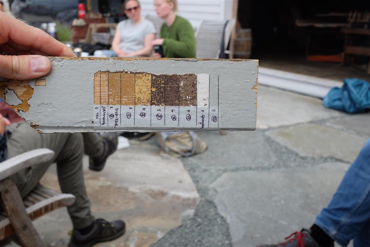 Til å få fram de ulike lagene og rekkefølgen av dem gjennom tiden, lager konservatorene gjerne en fargetrapp der hvert lag blir eksponert i en rute av et kledningsbord eller en list.