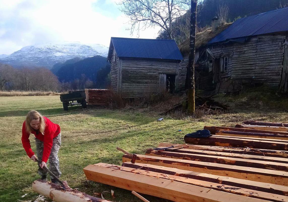 Kristin Bern har tatt sin tørn med barkeøksa underveis. – Det tok en dag å barke hver stokk for min del, men med Jostein gikk det raskere. Vi driver gården på Ritland og har vært her så mye som mulig sammen med snekkerne. Det har vært en fantastisk gjeng og vi har hatt det mye moro disse årene, kommenterer Kristin Bern.