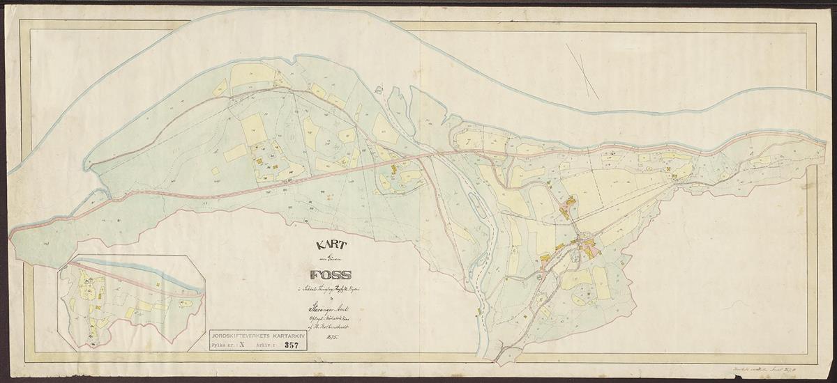Kartet fra 1875 viser hvordan gården Foss var organisert på denne tiden.