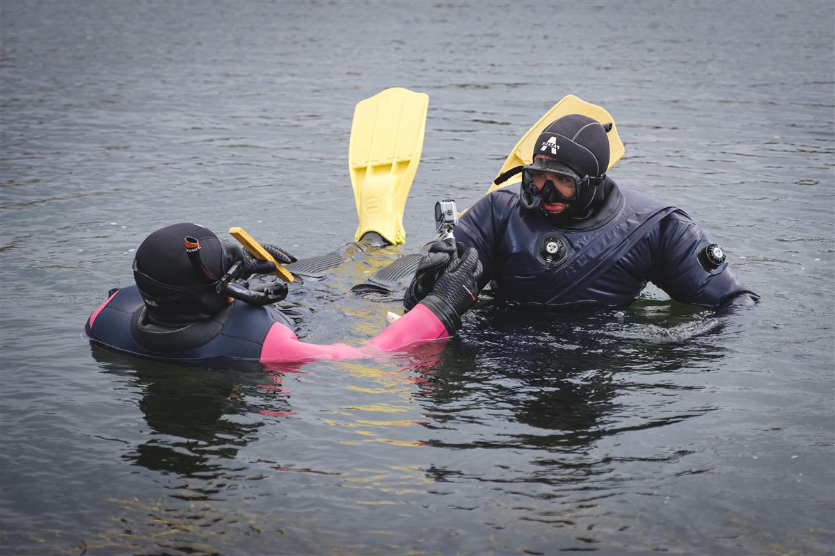 Med tørrdrakter på, dykkermaske og svømmeføtter, vasser de to arkeologene ut i den kalde sjøen. De snorkler langs land og prøver å danne seg et bilde av hva de finner av menneskespor under havoverflaten. De bruker kamera til å ta bilder og film under vann, og dokumenterer funnene de gjør med bruk av GPS.