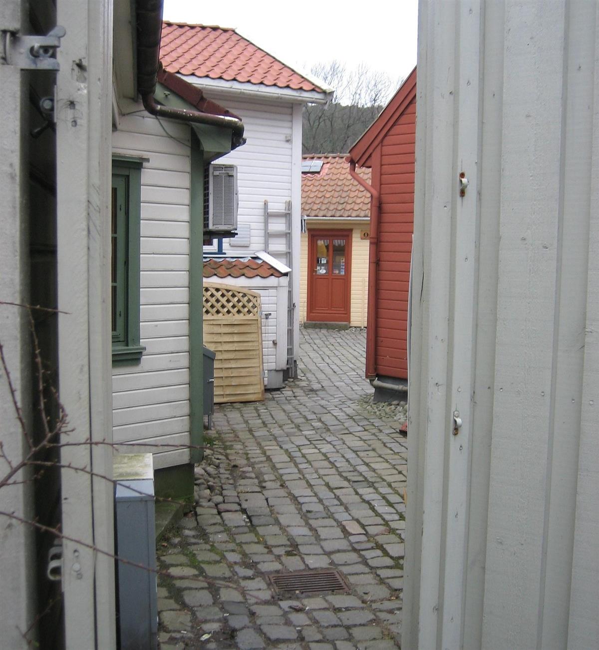Bakgårdsmiljø fra Jernbanegaten i Egersund. Trehusene står tett i tett