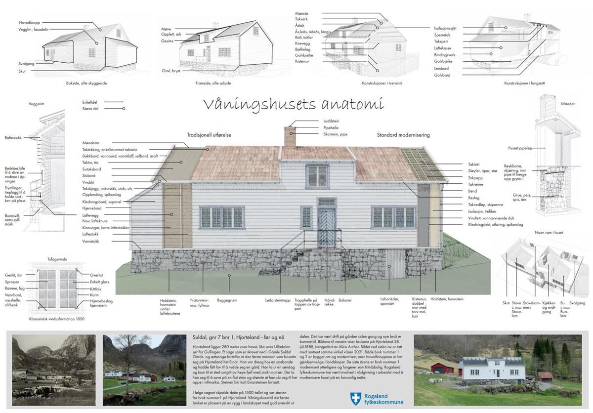 Vi har samlet ord og uttrykk som er vanlige ved et typisk verneverdig hus. Last ned pdf og skriv ut plakaten om våningshusets anatomi (PDF, 13 MB)