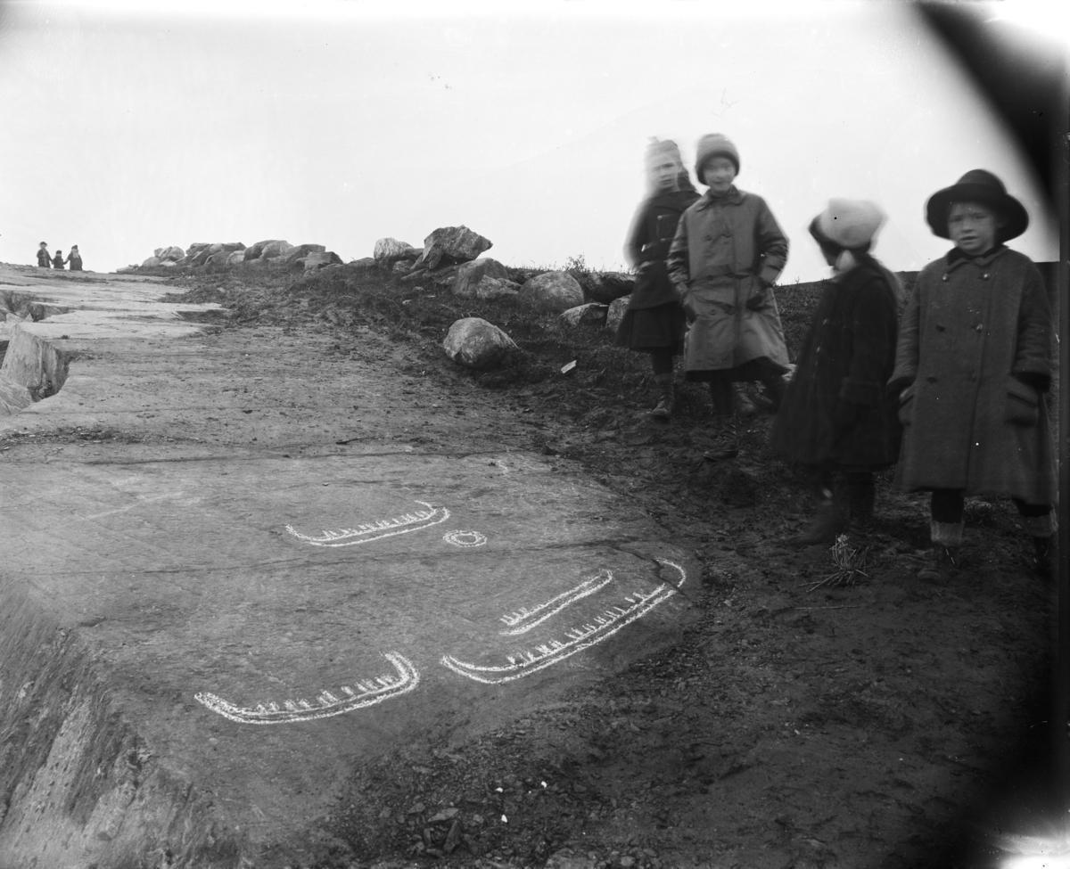 Dokumentering av helleristningene på Rudlå en gang mellom 1915-1920. Interessant både for fotografen og barna som bodde i nærområdet den gang.